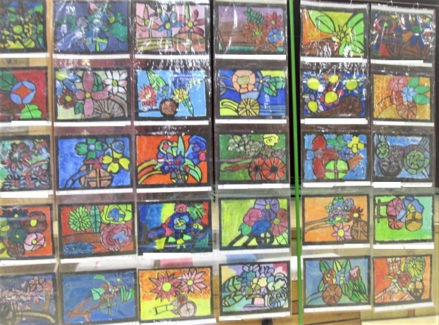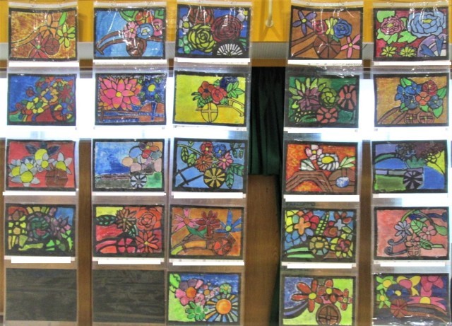 5年生の平面作品「花車」を一部紹介します。子どもたち一人ひとりの花車がステンシル版画でカラフルに表現されていました。