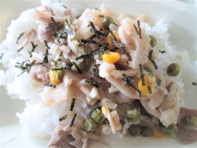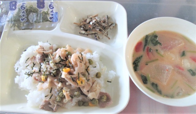 今日の給食は、「正月の行事献立」で、れんこんのちらしずし、ぞう煮、ごまめ、牛乳🥛です。