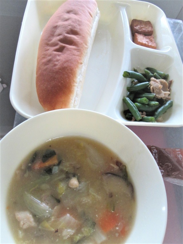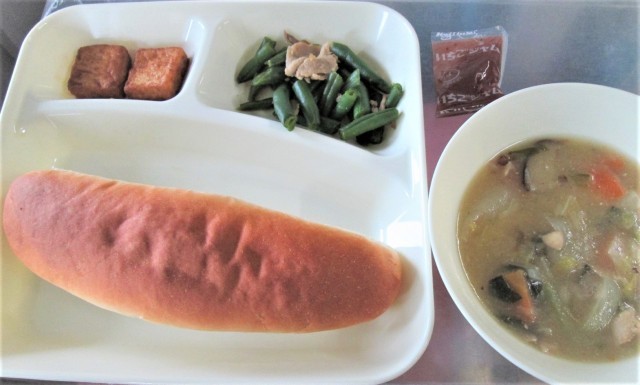 今日の給食は、はくさいのとろみ煮、あつあげのピリ辛じょうゆかけ、豚肉とさんどまめのオイスターソースいため、コッペパン、いちご🍓ジャム、牛乳🥛です。