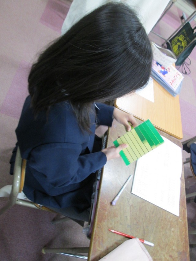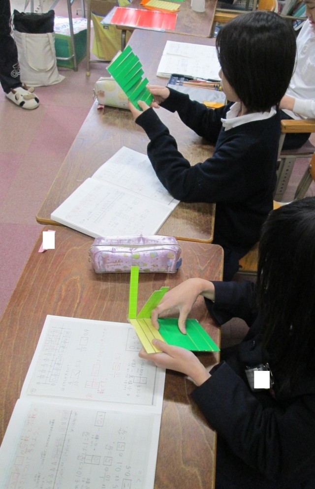 なかよし学級で算数の学習に取り組んでいます。分数の学習で、手作りのツールを使って、分数の意味を学んでいます。