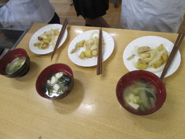 「お味噌汁と副菜」で、各グループで考えたお味噌汁の具や副菜を調理しました。