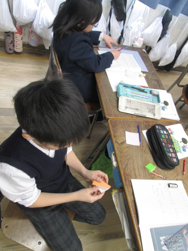 具体物である正方形の紙を折って、同じ大きさに4つに分けて1つ分がもとの大きさの四分の一であることを学びました。