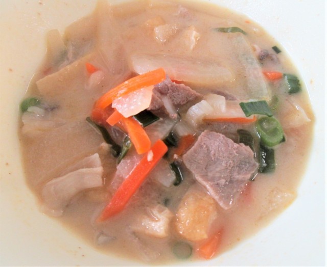 かす汁は、酒かすを入れた具だくさんの汁ものです。酒かすの働きで体が温まるので、冬に食べられることが多い料理の一つです。