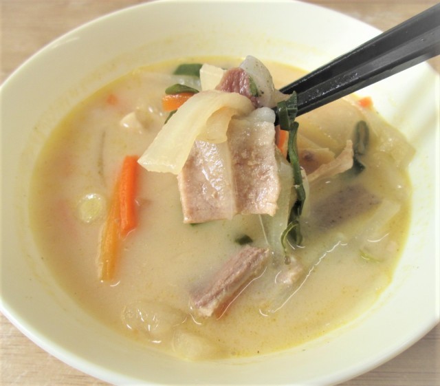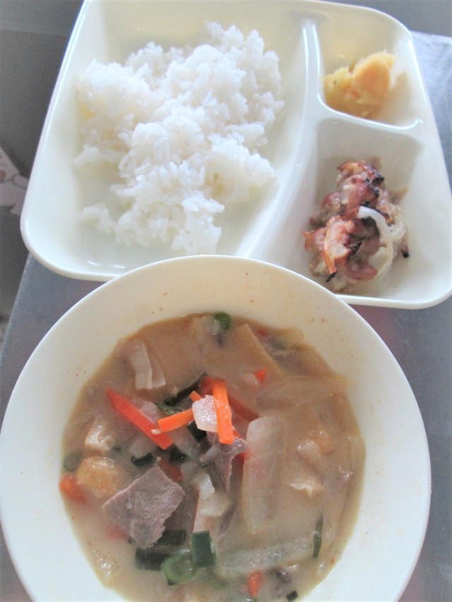 今日の給食のかす汁は、豚肉、つきこんにゃく、うすあげ、だいこん、にんじん🥕、青ねぎが入っています。