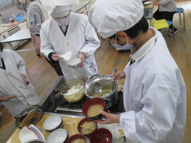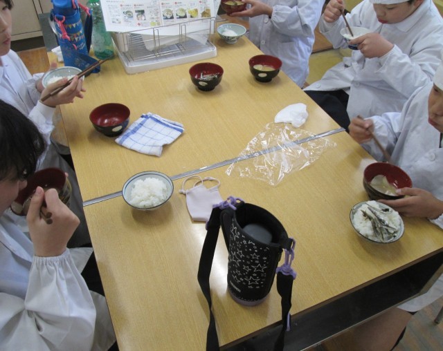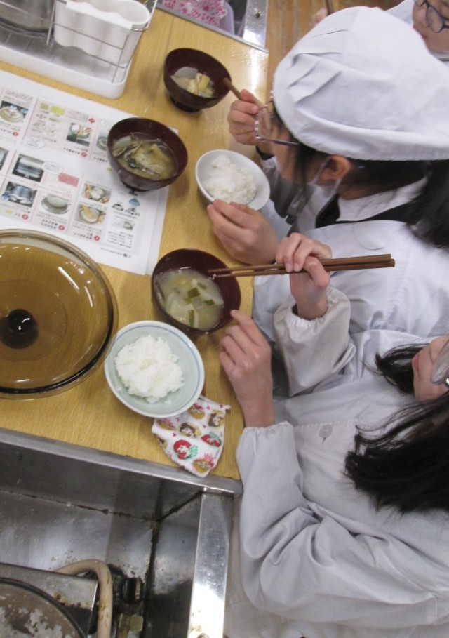 5年生が家庭科の調理実習で、「ごはんとみそ汁」を作りました。