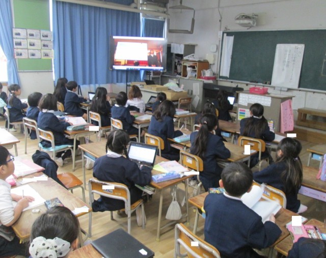 写真は、保健委員会のビデオでの発表を見ている1年生の子どもたちの様子です。