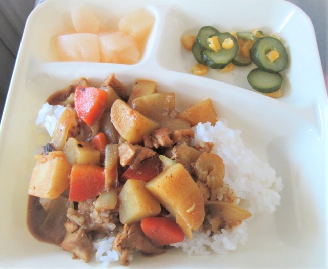 今日の給食は、チキンレバーカレーライス🍛、きゅうり🥒とコーン🌽のサラダ、洋なし(カット缶)、牛乳🥛です。