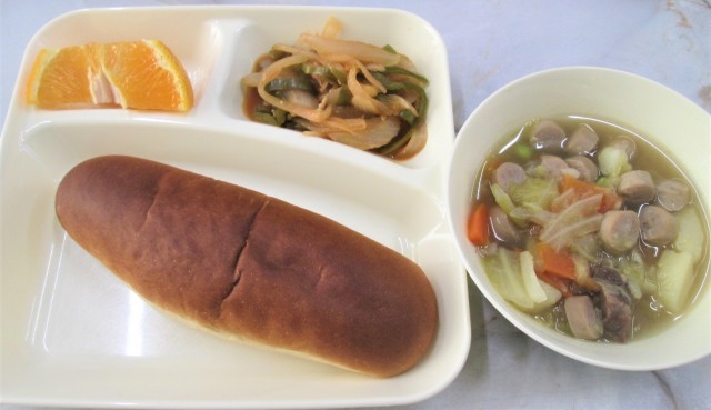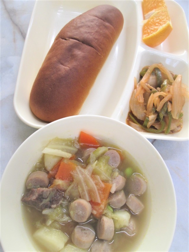 今日の給食は、ポトフ、鶏肉と野菜のケチャップソテー、デコポン、黒糖パン、牛乳🥛です。
