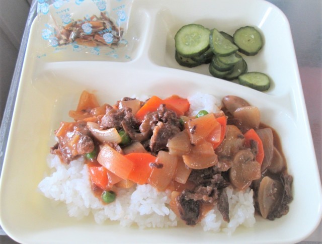 今日の給食は、ハヤシライス、きゅうり🥒のバジル風味サラダ、いもけんぴフィッシュ、牛乳🥛です。