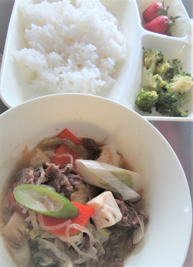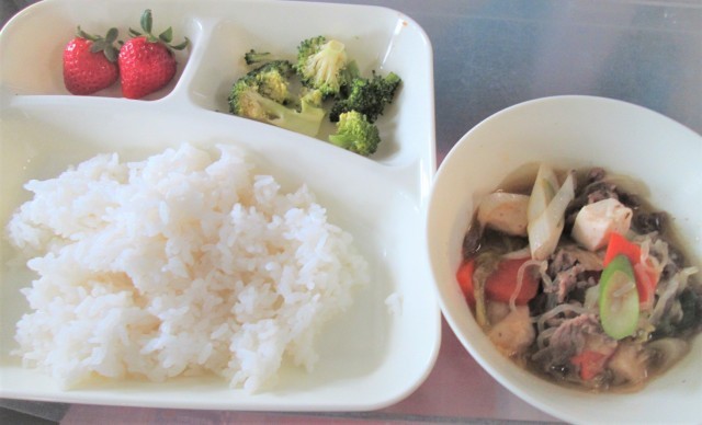 今日の給食は、すき焼き煮、ブロッコリー🥦のしょうがづけ、いちご🍓、ごはん🍚、牛乳🥛です。