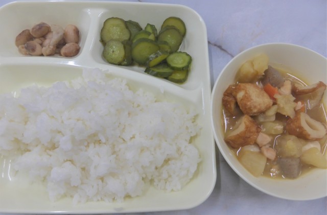 今日の給食は、関東煮、きゅうり🥒の梅風味、とら豆の煮もの、ごはん🍚、牛乳🥛です。