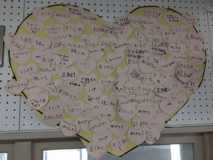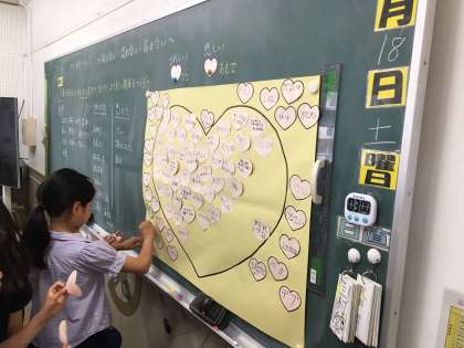 土曜参観での学習で、自分が今まで言われてうれしかった言葉と悲しかった言葉を思い出して、その言葉をハートの紙に書き、みんなの言葉を大きな紙に貼りました。うれしかった言葉には「ありがとう」「すごいね」「きれいな字やね」などなど本当にたくさんの言葉が出ました。一方悲しかった言葉もみんなの様々な言葉が出てきました。これから友だちとより良い関係を作っていくためには悲しい言葉を言わない事が大切です。そこでハートの外側に貼った悲しかった言葉を封筒に入れて封印し、ハートの内側に貼ったうれしかった言葉をみんなで確認しました。これからこういった温かい言葉があふれる学年にしていきます。