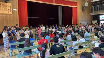 6月13日、講堂で3年生と6年生のリコーダー交流会をしました。