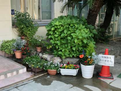 玄関には立て看板などのほか、PTA環境委員会の方々がきれいに植えてくださった花が彩を添えてくださっています。