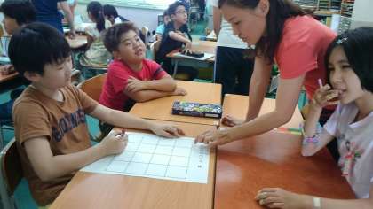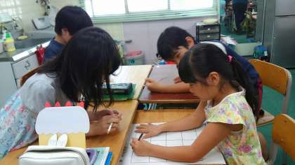 まず、7月生まれのおたん生日会をして、そのあと、なかよしタイムに参加している子や先生の名前をビンゴカードに書いていきました。「誰の名前をどこに書く?」「あの子の名前をかこう」とグループで相談しあう姿が見られました。