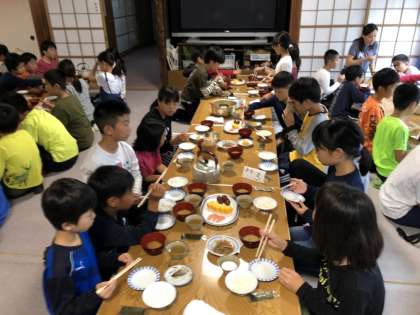 味噌汁、ご飯をよそったりお茶を入れたりと大変ですが、班のみんなのために頑張ってくれています。