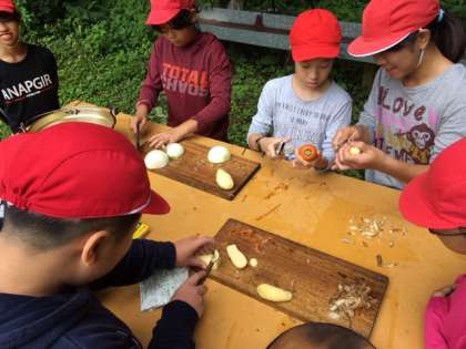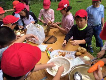 大きく分けて「調理係」と「かまど係」の2つに分かれてカレーライスを作ります。