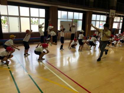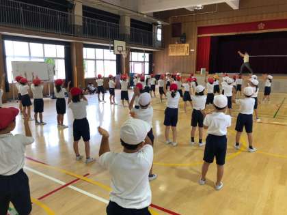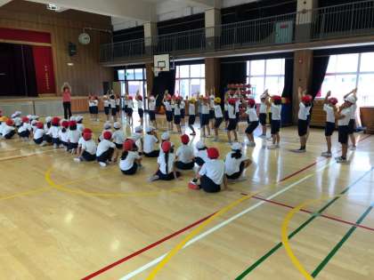 9/2(月)から運動会に向けた練習が始まりました。運動会当日、90周年をお祝いする花火を表現する動きをみんなで考えて、発表し合ったり、実際に表現したりしました。