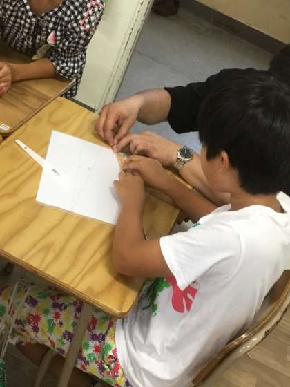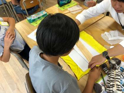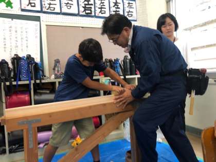 子どもたちが木のストロー作りとカンナ削り体験をしている様子です。