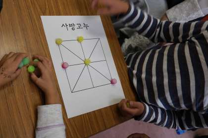 その後は、コンギ(おはじき遊び)やコヌノリ(すごろく遊び)をしました。4月の頃に比べ、ポラム学級メンバーの仲が深まってきたのが、遊びや活動を見ているとよく分かります。