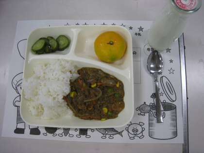 この日のメニューは、米粉のカレールウの素を使用したドライカレー、きゅうりのサラダ、みかん、牛乳でした。