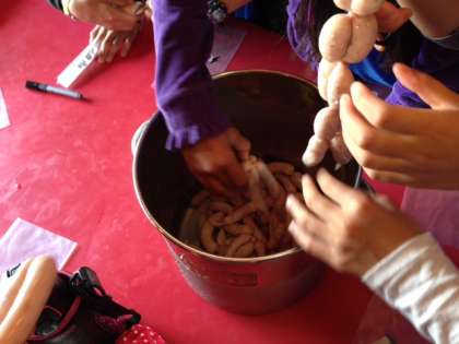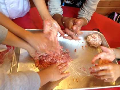 朝食の後は、手作り粗挽きソーセージ作りに挑戦です。まずはお肉をコネコネします。お肉の冷たさや感触にびっくりです。羊の腸にお肉を詰めていきます。破れないように均等に詰めていく作業に大苦戦です。食べやすい大きさにして出来上がりです。お土産に持って帰りますので、ご家庭で土産話を聞きながらいただいてください。