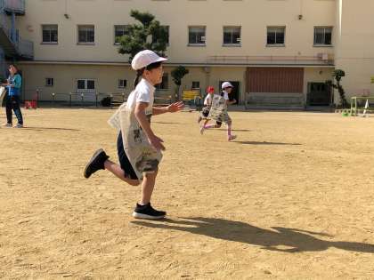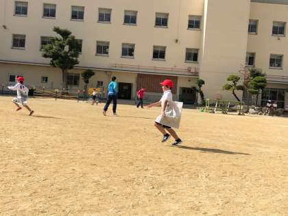 今日の体育では、「新聞かけっこ」をしました。新聞紙を手で持たず、落とさないように走ります。大きな声で友だちを応援したり、笑顔で走ったりしました。