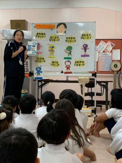 保健室の奥本先生からの保健指導では、感染症などの病原菌から体を守るために必要なことを教えてくださいました。「手洗い・うがい」「栄養をとる」「睡眠をとる」「体力をつける」「マスクをつける」「部屋を喚起する」の6つを普段の生活から心掛けていこうという話でした。