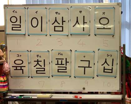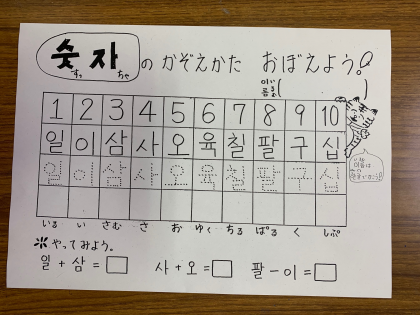 ハングルで書かれた数字のカードをを小さい順に並べていったり、数字をハングルで書く練習もしました。