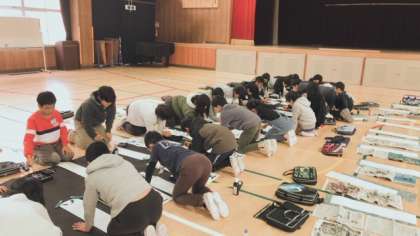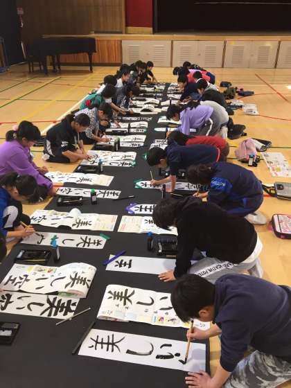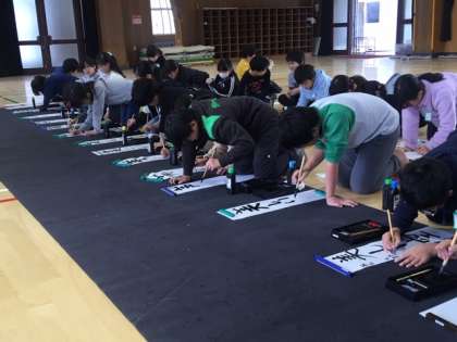 講堂で書き初めを行いました。2020年、字が上手になるように気持ちをこめて書きました。