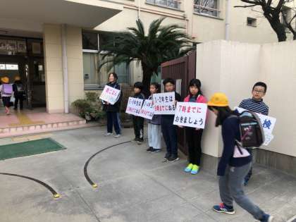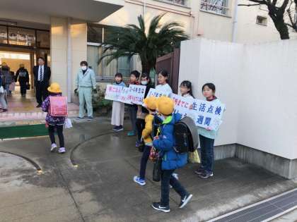 今週1週間、保健委員会の児童が、登校時に「早寝」「早起き」「朝ご飯」について呼びかけを行いました。