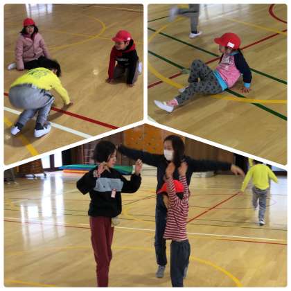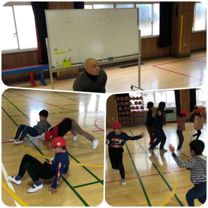 はじめに1月のお誕生日会をしました。その後、講堂に行って表現運動をしました。