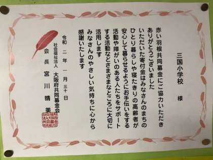 1月に実施した「赤い羽根募金」の感謝状が届きました。集まった募金は、36,477円でした。ご協力いただきありがとうございました。