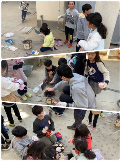 冷たい水での網洗いから始まり、火起こし、餅焼きへの体験をしました。火起こしでは、煙に涙しながら必死に炭へ火を移していました。餅焼きでは、火の調整に苦労しながらも仲間と協力して焼き、美味しく食べていました。