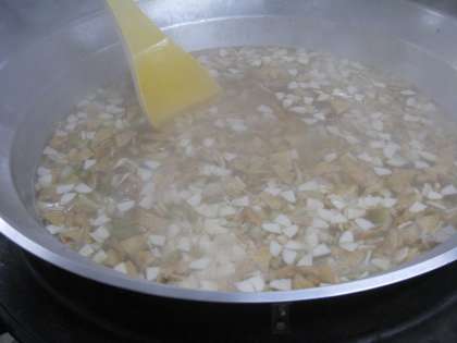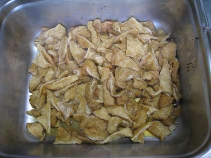 うすあげは三角に切ってから、砂糖、みりん、こいくちしょうゆを合わせた調味液とミニバットに入れ、焼き物機で蒸し焼きにして甘辛く煮ました。
