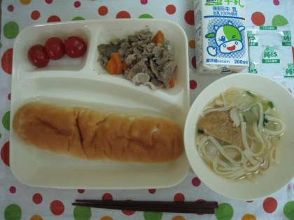 この日の給食は、おさつパン、牛乳、豚肉とごぼうの煮もの、なにわうどん、プチトマトでした。