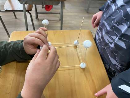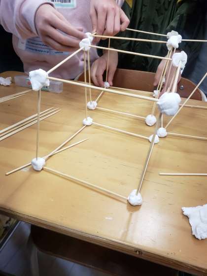算数科の「箱の形を調べよう」の単元では、直方体と立方体について学習しています。本時では、直方体と立方体の特徴について調べました。竹ひごを使って、直方体と立方体を作り、面(6つ)や辺(12本)、頂点(8つ)の数は等しいが、辺の長さや面の形は違うことに気付くことができました。