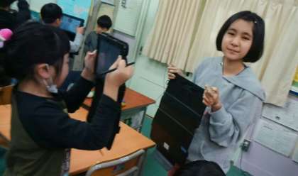 友だちや先生の笑顔な写真を「カシャ」「カシャ」。また、自分の名前や好きな絵を発表ノートに指でかいて、みんなで見せ合いました。「こんな感じになるんだ、おもしろい。」と楽しんで取り組むことができました。「また使ってみたい。」という声も、たくさん出ました。
