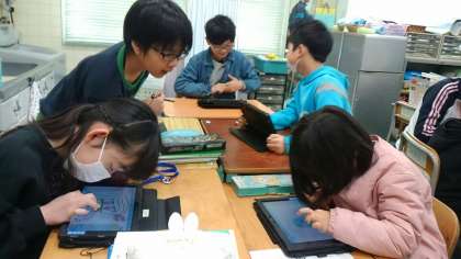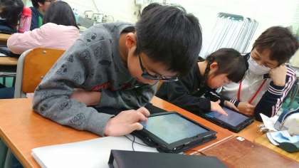 タブレットを使って、写真を撮ったり、文字や絵を指でかいたりしました。初めて触る子どももいて、タブレットに興味津々。
