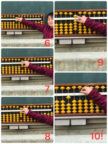 一だまと五だまを動かして数を表していきます。6から9は、一だまと五だまを組み合わせます。10は、十の位に1を入れ、一の位には何も入れません。