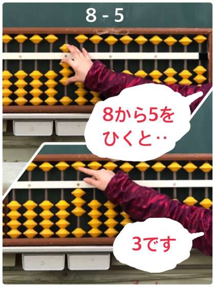 一だまと五だまを組み合わせて、たし算・ひき算をしていきます。