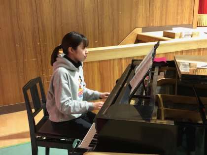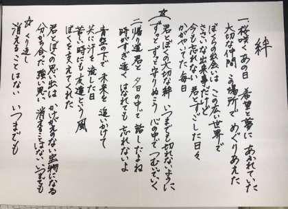 卒業式ではみんなで最後に練習した「絆」を2部合唱しましょう。この歌詞を味わいながら、もう一度家で歌の練習をしておいてくださいね。先生もピアノの練習をしています。
