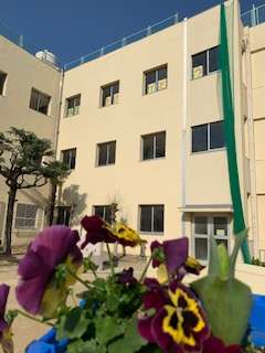 運動場には、きれいなパンジーの花道が!