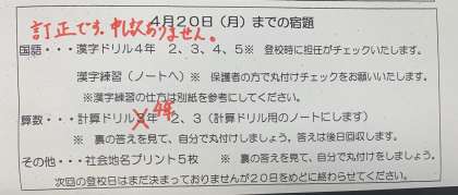 もう一つ、お知らせしたいことがあります。4/12(日)より、配付しています学年だより「4YOU」の課題の欄に間違いがありました。申し訳ありません。4/20までをめどにした課題で、算数の計算ドリル4年のことが、誤って3年になっていました。正しくは、4年の計算ドリルです。