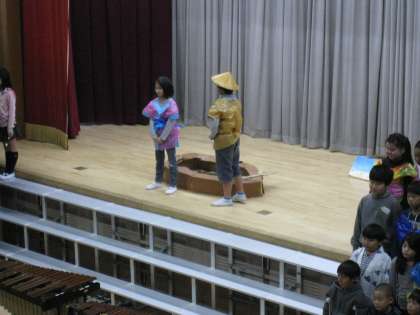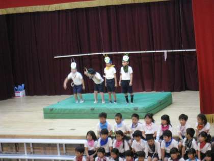 低学年は一生懸命さで、中学年は工夫をこらして、高学年は力強く、それぞれ想いを伝えようと表現していました。各学年の特色も楽しんでいただけたと思います。写真は5年生の『じごくのそうべえ』、2年生の『ワクワクたんけんたい』、4年生の『吉四六さんのとんち話』の様子です。
