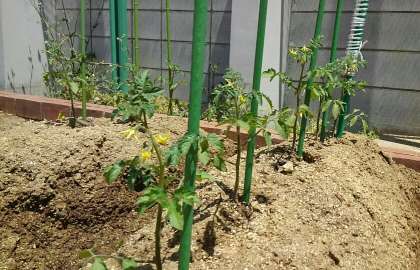 二週間前に植えたトマトの苗が少しずつ伸びて、黄色い花が咲き始めました。このまま成長して、ミニトマトの収穫できる日が楽しみですね。