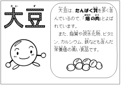 実は、大豆には、日本人が不足しやすい鉄が含まれています。給食では、みなさんの体に必要な鉄をとってもらうために、人気のあるカレーに大豆を入れています。