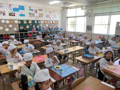1年生では昨日から給食が始まっています。例年なら、6年生の児童が運搬・配膳を行うのですが、今年度は、休校の関係ではじめから1年生の児童で運搬をしています。1年生の児童たちは、はじめての給食を食べて「おいしい!」や「明日はどんな給食かな?」ととてもたのしみしている様子です。