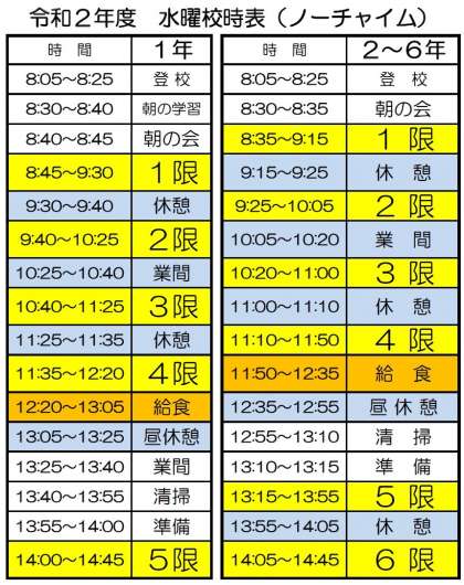 そこで本校では、今週から2年生以上の学年を、毎週水曜日に1コマ40分の6時限授業とし、今日から登校・下校時刻以外はチャイムを鳴らさない「ノーチャイムデー」としています。
