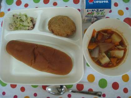 3日(金)の献立は、チキンレバーカツ、ケチャップ煮、たことキャベツのバジルソテー、黒糖パン、牛乳でした。